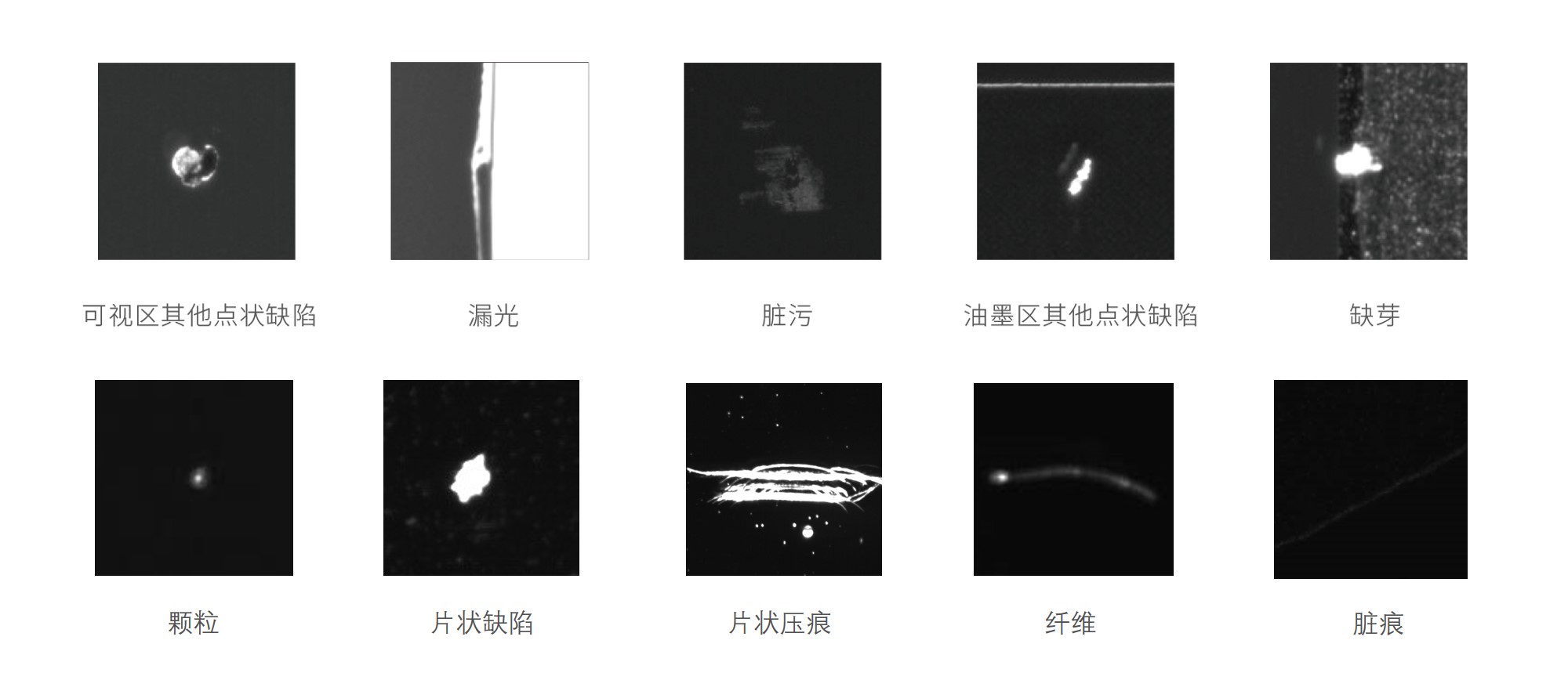 划伤、点伤、脏污、崩边、凹凸点、油墨透光、孔瑕疵、异色